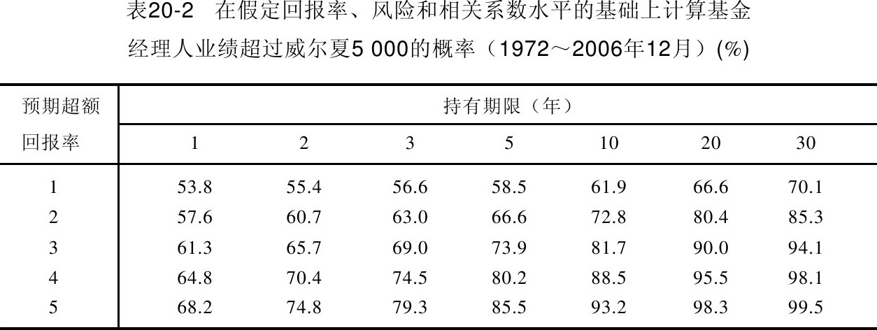 我们绝对有理由相信麦哲伦基金之所以在彼得·林奇时期的业绩如此优秀是因为彼得·林奇在选股上的丰富经验。但是对于大多数基金经理人而言,我们无法断定他们获得的高额回报到底是因为其拥有高超的选股技能还是仅凭运气。表20-2计算了选股能力高于平均水平的经理人业绩超过市场平均水平的概率。