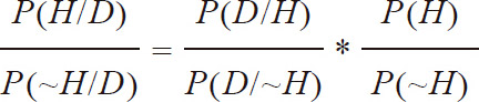 在这个比值或者说胜率形式中,从左向右,三个比值项依次代表:获得新数据(D)后,支持焦点假设(H)成立的后验胜率;被称为似然比(LR)的一项,即焦点假设成立时获得该数据的概率除以备择假设成立时获得该数据的概率;以及支持焦点假设成立的先验胜率。特别地