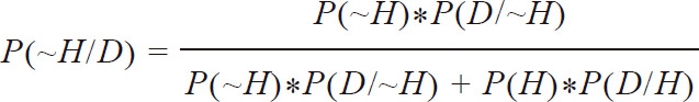 为了说明这种思维错误,下面将使用一种不同形式的贝叶斯规则——通过简单的数学变形即可得到。之前出现的公式是针对给定一些新数据(D)后,焦点假设(H)成立的后验概率。当然也可将公式改写成,给定一些新数据(D)后,非焦点假设(~H)成立的后验概率
