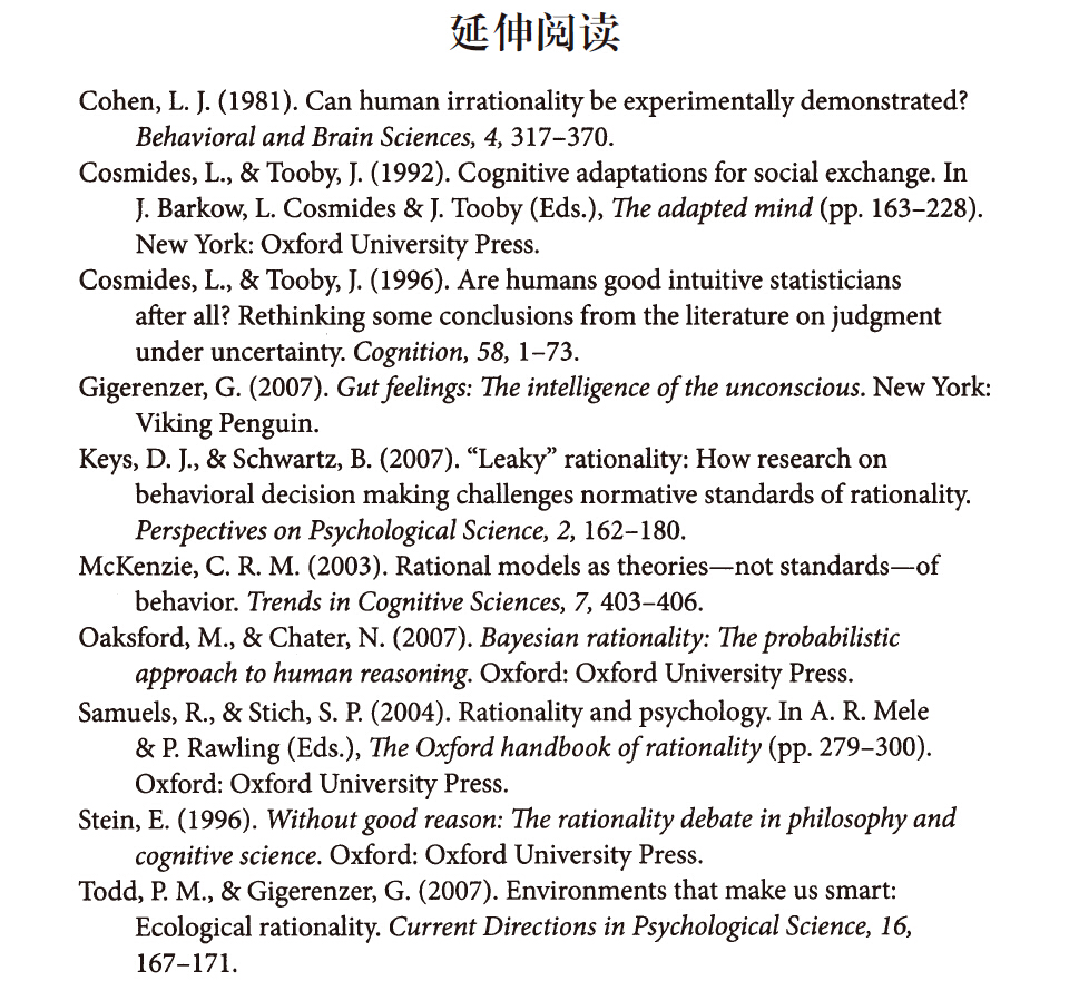 智力、思维倾向以及发育上的数据,在趋势上并不完全统一,并且在许多任务上的数据还比较稀缺,然而它们似乎都指向了同一个方向。总体看来,依据第2、3章中对标准任务描述的定义,理性思维倾向于随认知成熟度而递增。简而言之,启发式和偏见研究测试中的被试反应是有差异的,而这种差异是系统性的,并非误差偏差所致。在第5章中,我们将看到,这种人类行为中的差异所包含的各方面问题,如果都能被研究完全理解,那么我们就有可能调和理性大争论中两大阵营各自所依据的基本观点。