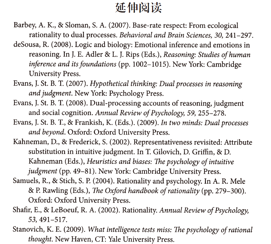 在本章中,我们介绍了理解人类认知的双重加工框架。尽管对这些模型的细节还有很多持续的争议(Carruthers,2006;Evans&Frankish,2009),但它们所起到的重要作用是,提供了一个整合过分乐观派和社会改良主义观点的框架。事实上,在理性大争论中,这些理论家提出的关键观点并没有表面上看来那么相互矛盾。