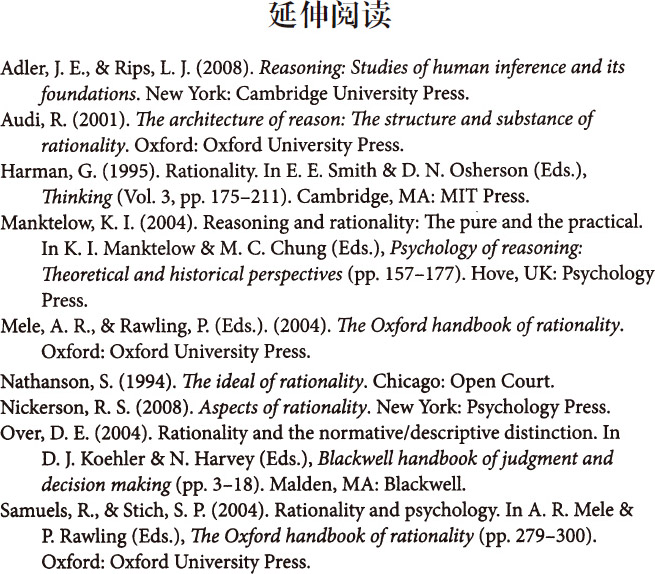 然而,建立一种对理性包括了对需求本身的评价的广义理论并不容易,需要面对哲学和认知科学中一些异常艰难的问题,在第6章中我们会涉及其中一些复杂之处。由于心理学的判断和决策领域,主要反映了对产生理性行为的思维过程(依据目标采取合适行为)的研究,以及信念理性(持有与现实相适应信念)的研究,本书将首先在第2章介绍前者(工具性理性),第3章介绍后一部分(认识性理性)。在这两章中我们将提到,人们很多时候的表现会偏离这两种理性的范畴。第4章将主要介绍认知科学中的理性大争议,即对如何解释第2、3章中提到的违背理性原则的实证结果的争议。其中,传统的直观推断和偏见领域的学者,将人们对最优决策规则的违背,解释为人类认知过程中还存在有待改善的缺陷之处。而与之相比,发展心理学家和其他一些理论家,则强调了人们对判断和决策任务产生反应的一种可适应性。在第4章我们会详细论述这些实证文献中的其他解释。第5章将会介绍一种能够调和理性大争议双方观点的认知双加工理论。第6章则涉及狭义理性理论的不足,以及判断和决策制定领域的一些更为广义上的问题。例如,个体什么时候表现得理性(狭义上)是理性的?追求什么样的目标是理性的?在一些合作情境中,如果每个人都出于理性只追求自身利益则谁也得不到好处,个体又该怎么做?