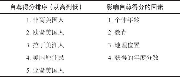 通过分析与被试居住的地理位置有关的自尊和年度数据,我们得到了有趣的发现。在群体人口较为密集的区域,非裔美国人和亚裔美国人的自尊水平最高。例如,非裔美国人的自尊水平在南部各州最高,因为这里的非裔美国人最多。同时,我们也发现,非裔美国大学的非裔美国学生比欧裔美国大学的非裔美国学生有更高的自尊水平。生活在西海岸的亚裔美国人比其他地方的亚裔美国人有更高的自尊水平,因为西海岸亚裔美国人较为密集。