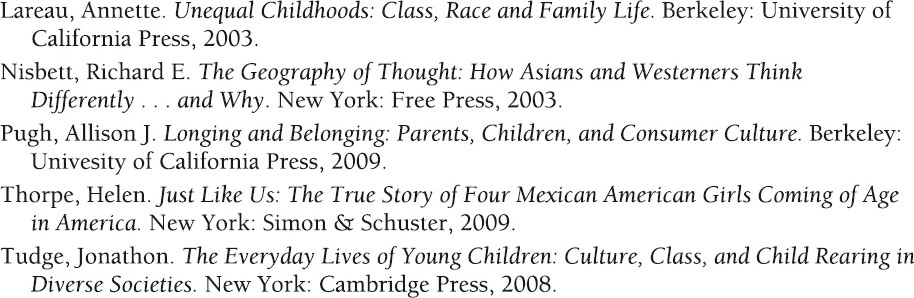 安特妮·拉鲁(Annette Lareau)走进中产阶级家庭(管理人员或大学学历以上的人)、工人阶级家庭(从事非技能性的、低水平的、白领工作的人,不需要管理能力)以及欧裔和非裔美国背景下的贫穷父母(接受政府救济金的人)。她和助手详细观察和记录在不同时间,每个家庭在大约20个场合中发生的互动,跟随孩子和家人到学校和医院。正如哈特、里斯利和拉鲁的发现一样,他们也发现了所有社会群体所共同的家庭生活成分,以及社会经济差异对孩子的影响遮盖了民族背景的影响。