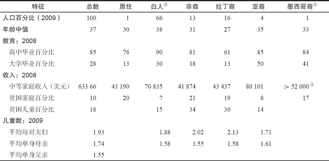 表2-2呈现了美国6个主要民族群体的基本人口特征。从表中我们可以看出,欧裔、亚裔、中东裔美国人在收入和受教育方面高出平均水平。近期经济的下滑极大地影响那些资源极少的群体,如非裔美国人和拉丁美洲人,增加了贫困水平。资源和教育的不同关系到更高的婴儿死亡率、更多的健康问题以及更短的生命。我们将在后面的部分讨论贫穷问题。