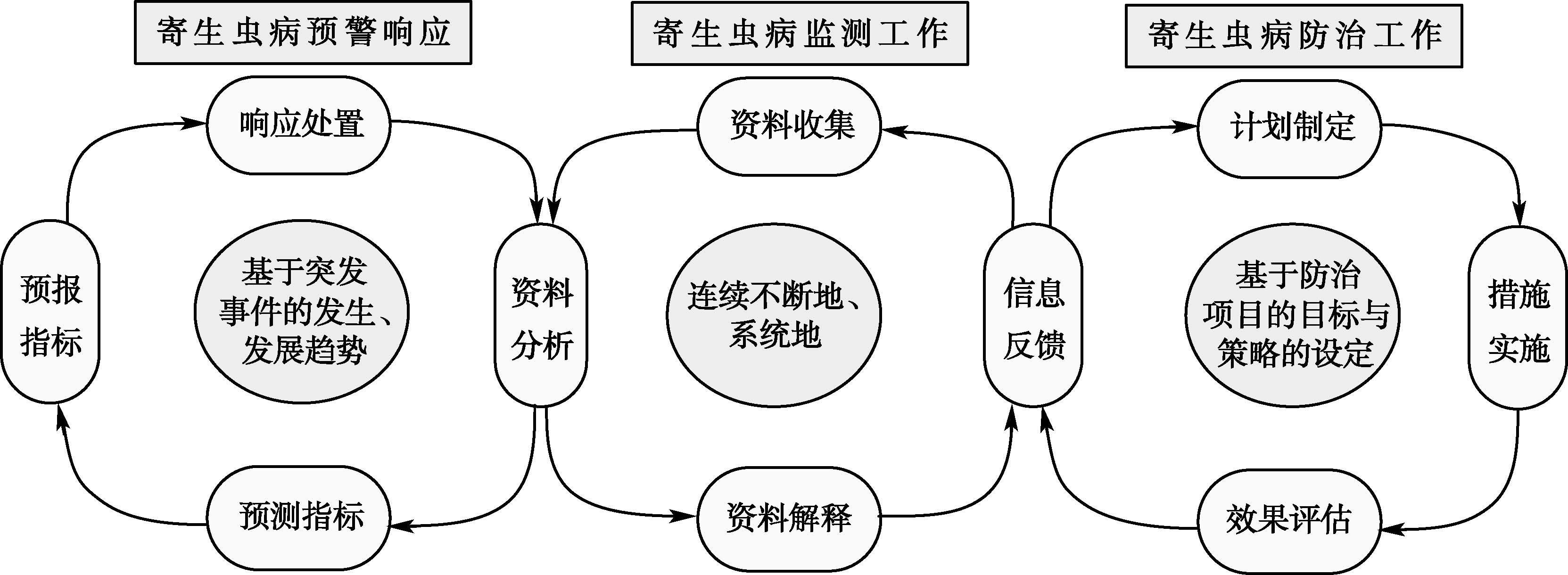 图1-1 寄生虫病监测工作的功能、防治工作和预警响应间