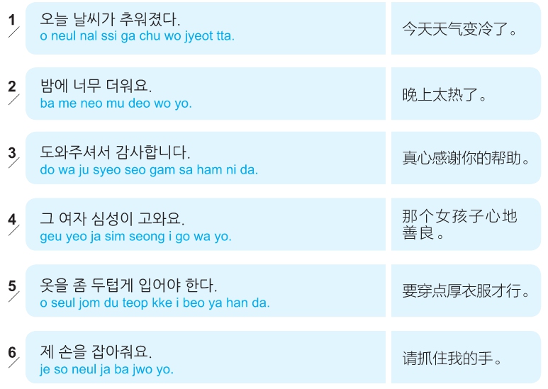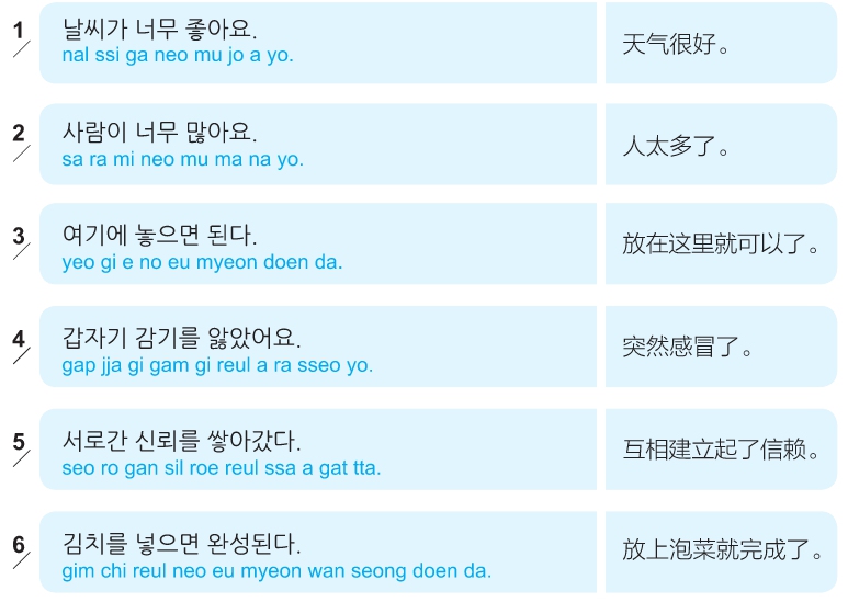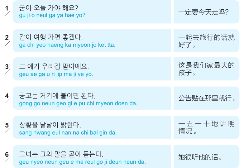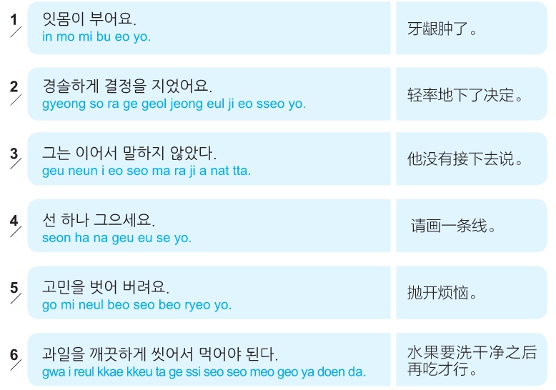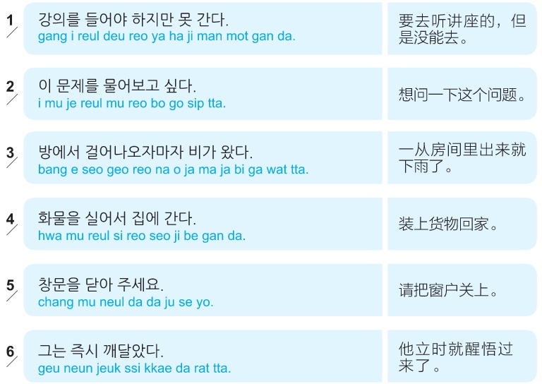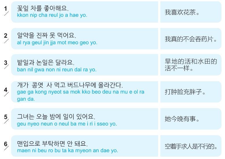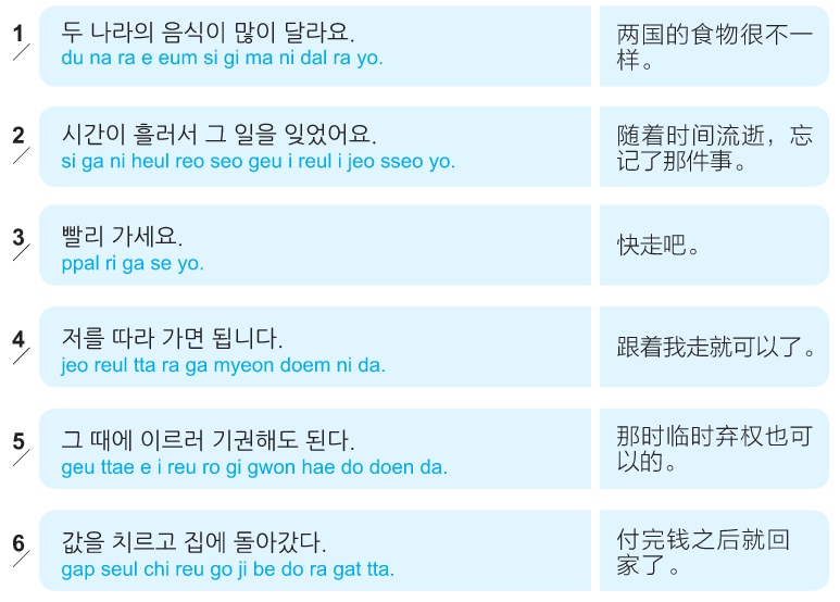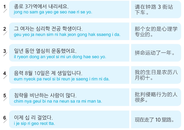 3) 在部分汉字词中,前一个字的收音为ㄹ,后面一个字的首音ㄷ, ㅅ, ㅈ出现紧音化现象,即发ㄸ(tt), ㅆ(ss), ㅉ(jj)。