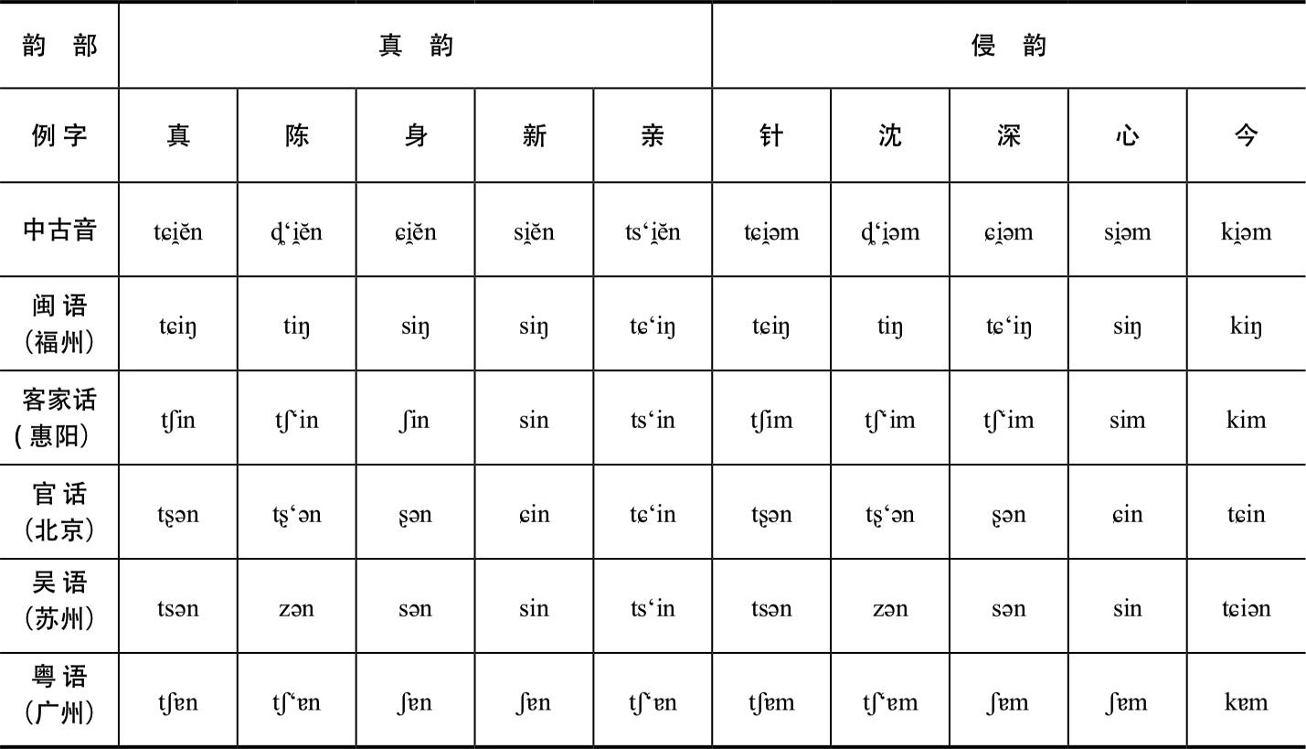 就历史上看,有许多字是古属彼呼,今属此呼的,而各地方言的演化又各有不同。例如“真”“侵”两韵,在古代是属于齐齿呼的,现代只有闽语与部分客家话能完全保存齐齿呼,在官话与吴语里就有一部分变入开口呼,粤语则完全变了开口呼。今用较严格的音标(即国际音标)列表举例,表见下页。