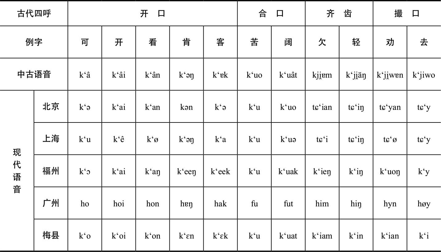 由下页的表看来,各地语音的演变都是很有条理的。福州与梅县完全保存着古代的[k‘];北京、上海开合字念[k‘],齐撮字变为[tɕ‘](注音符号ㄑ)。广州开、齐、撮字以念[h]为原则,合口字以念[f]为原则;“楷、亏、坤、旷、启、衾、窍、却、驱、缺”等少数字念[k‘],是例外。但这些例外字在广州都可算是文言里的字,也许广州在文言里能多保存些古音,与吴语的情形相反。