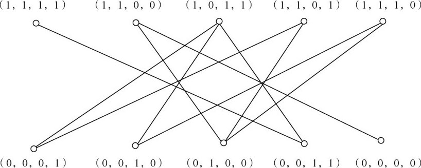 我们用一个长度为4的0,1序列来表示人、羊、狼、菜在摆渡发生前或后的位置,其中1表示北岸,0表示南岸。根据要求,我们列出可能的10种状态,分别用平面上10个点来表示,对于它们当中任何两个点,用一条线相连,当且仅当这两点所表示的位置状态可以通过一次摆渡转化。这样我们就得到了一张图(见图1.2),而图中从点(1,1,1,1)经过一些边到点(0,0,0,0)的每一种走法都对应一种可行的摆渡方案。