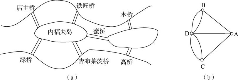 18世纪初在普鲁士的哥尼斯堡城有一条河穿过城市的中心,河中分布着两个小岛,这两个岛与河岸由七座桥连接起来,如图1.1(a)所示。有人提出一个有趣的问题,即一个步行者怎样才能不重复、不遗漏地一次走完七座桥,最后回到出发点。这一问题被命名为哥尼斯堡七桥问题,也被认为是图论学科的起源。这个问题看似非常简单,但是却难住了当时博学的教授们,最后大数学家欧拉解决了这一问题。他解决这一问题的过程可以看作是一个简单的数学建模过程。