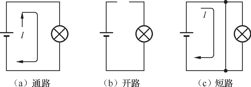 电路有3种状态:通路、开路和短路 ,这3种状态的电路如图1-6所示。