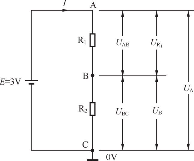 电路中的电位、电压和电动势与上述水流情况很相似。如图1-5所示,电源的正极输出电流,流到A点,再经R 1 流到B点,然后通过R 2 流到C点,最后流到电源的负极。