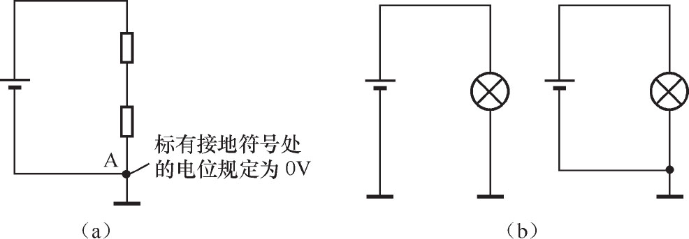 (2) 在电路图中,标有接地符号处的地方都是相通的 。图1-8(b)所示的两个电路图虽然从形式上看不一样,但实际的电路连接是一样的,故两个电路中的灯泡都会亮。