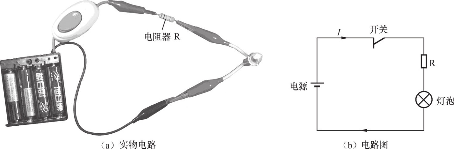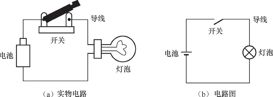 图1-1(a)所示是一个简单的实物电路,该电路由电源(电池)、开关、导线和灯泡组成。电源的作用是提供电能;开关、导线的作用是控制和传递电能,称为中间环节;灯泡是消耗电能的用电器,它能将电能转变为光能,称为负载。因此, 电路是由电源、中间环节和负载组成的 。
