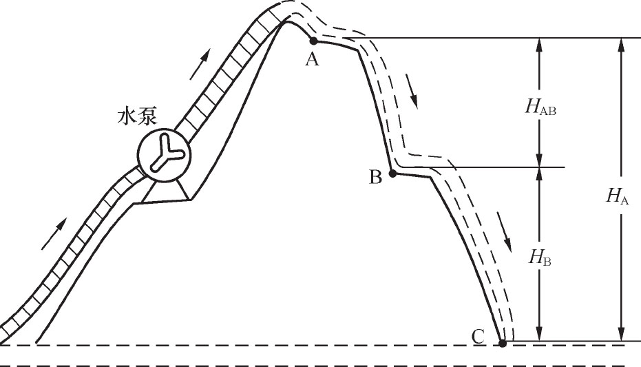 要测量A处和B处水位的高度,必须先要找一个基准点(零点),就像测量人身高要选择脚底为基准点一样,这里以河的水面为基准(C处)。AC之间的垂直高度为A处水位的高度,用 H A 表示,BC之间的垂直高度为B处水位的高度,用 H B 表示,由于A处和B处水位高度不一样,它们存在着水位差,该水位差用 H AB 表示,它等于A处水位高度 H A 与B处水位高度 H B 之差,即 H AB = H A - H B 。为了让A处源源不断有水往B、C处流,需要水泵将低水位的河水抽到高处的A点,这样做水泵是需要消耗能量的(如耗油)。