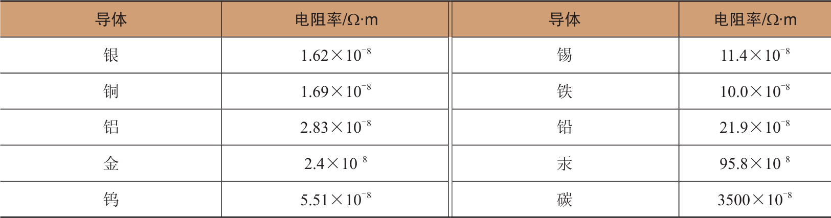 在上式中, L 为导体的长度(单位:m), S 为导体的横截面积(单位:m 2 ), ρ 为导体的电阻率(单位:Ω·m)。不同的导体, ρ 值一般不同。表1-1列出了一些常见导体的电阻率(20℃时)。