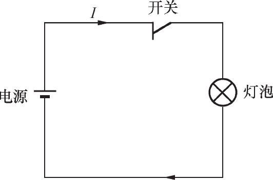 在图1-2所示电路中,将开关闭合,灯泡会发光,为什么会这样呢?原来当开关闭合时,带负电荷的电子源源不断地从电源负极经导线、灯泡、开关流向电源正极。这些电子在流经灯泡内的钨丝时,钨丝会发热,温度急剧上升而发光。