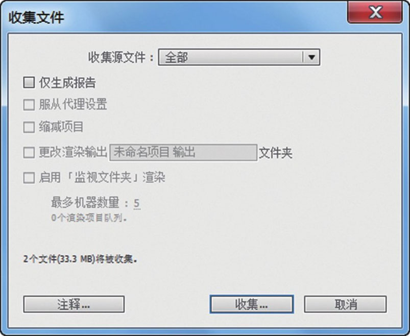 这里主要介绍After Effects的打包功能。选择“文件 > 收集文件”命令,在弹出的对话框中单击“收集”按钮,完成打包操作,如图1-21所示。