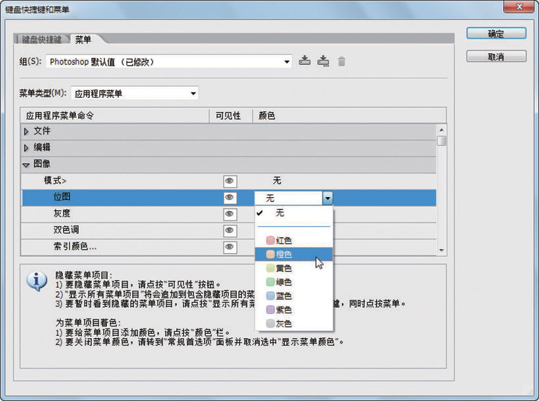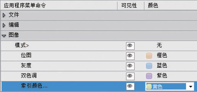 为了突出显示需要的菜单命令,可以为其设置颜色。选择“窗口 > 工作区 > 键盘快捷键和菜单”命令,弹出“键盘快捷键和菜单”对话框,在要突出显示的菜单命令后面单击“无”下拉按钮,在弹出的下拉列表中可以选择需要的颜色标注命令,如图2-10所示。可以为不同的菜单命令设置不同的颜色,如图2-11所示。设置好颜色后,菜单命令的效果如图2-12所示。