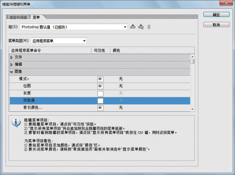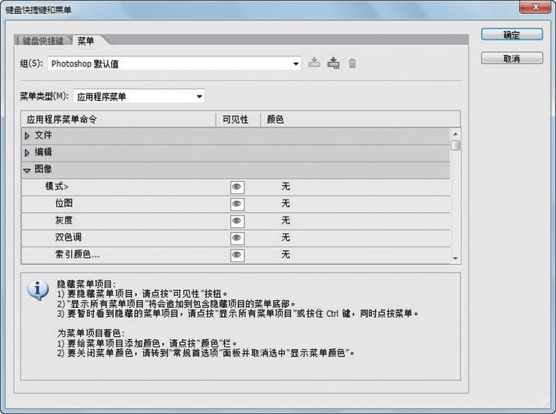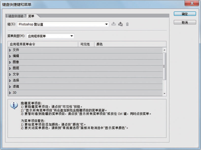 可以根据操作需要隐藏或显示指定的菜单命令。不经常使用的菜单命令可以暂时隐藏。选择“窗口 > 工作区 > 键盘快捷键和菜单”命令,弹出“键盘快捷键和菜单”对话框,如图2-5所示。