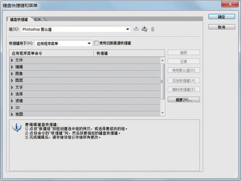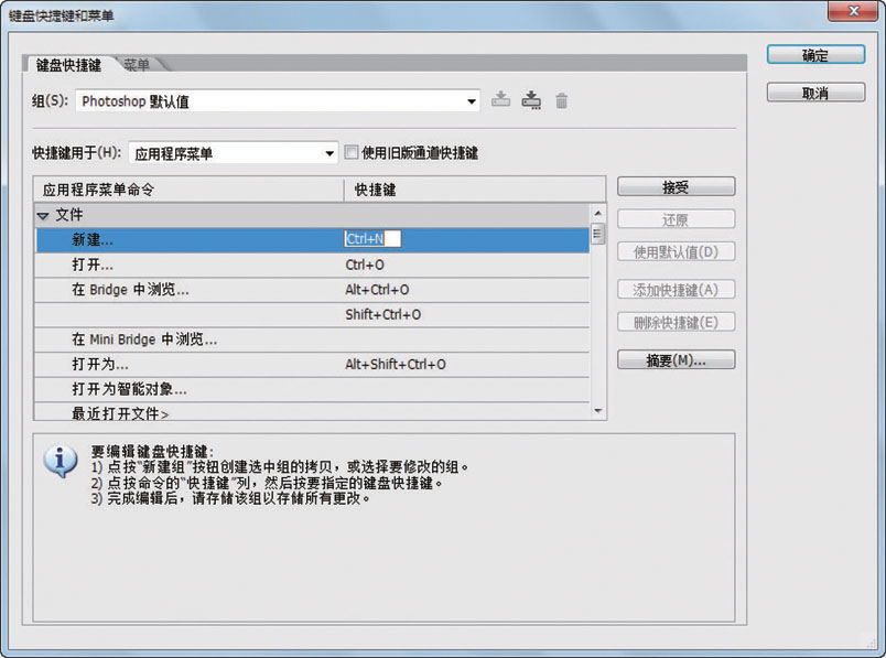 选择“窗口 > 工作区 > 键盘快捷键和菜单”命令,弹出“键盘快捷键和菜单”对话框,如图2-13所示。在对话框下面的信息栏中说明了快捷键的设置方法,在“组”选项中可以选择要设置快捷键的组合,在“快捷键用于”选项中可以选择需要设置快捷键的菜单或工具,在下面的选项窗口中选择需要设置的命令或工具进行设置,如图2-14所示。