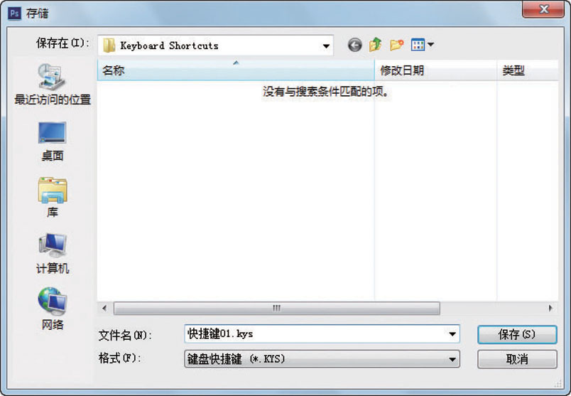 ,弹出“存储”对话框,在“文件名”文本框中输入名称,如图2-15所示。单击“保存”按钮则存储新的快捷键设置。这时,在“组”选项中即可选择新的快捷键设置,如图2-16所示。