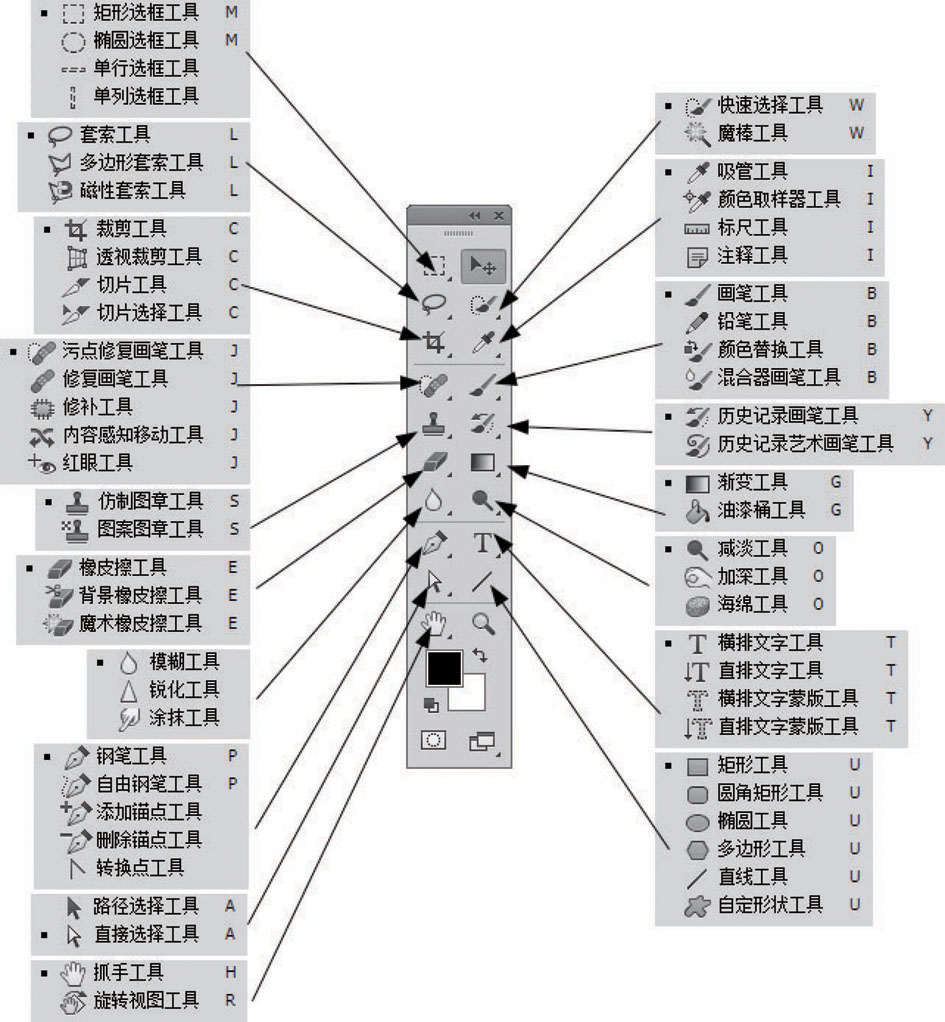 :Photoshop CS6的工具箱可以根据需要在单栏与双栏之间自由切换。当工具箱显示为双栏时,如图2-19所示。单击工具箱上方的双箭头图标