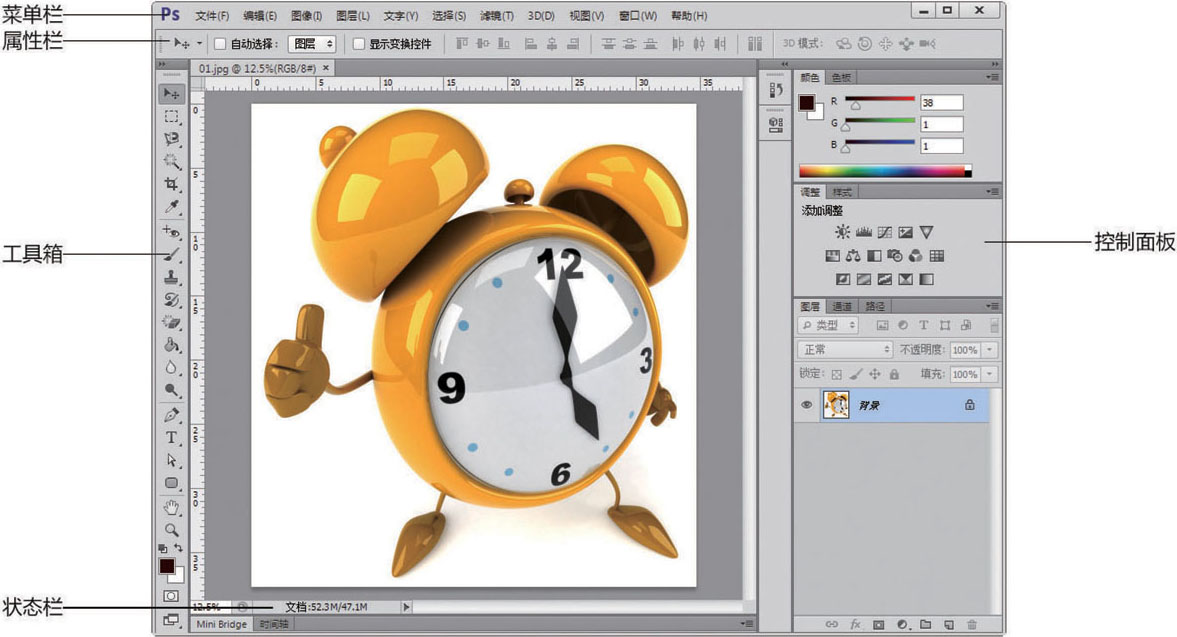 熟悉工作界面是学习Photoshop CS6的基础。熟练掌握工作界面的内容,有助于初学者日后得心应手地驾驭Photoshop CS6。Photoshop CS6的工作界面主要由菜单栏、属性栏、工具箱、控制面板和状态栏组成,如图2-1所示。
