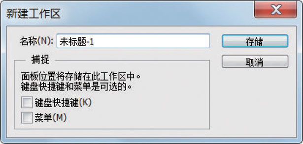 设置完工作区后,选择“窗口 > 工作区 > 新建工作区”命令,弹出“新建工作区”对话框,如图2-37所示。输入工作区名称,单击“存储”按钮,即可将自定义的工作区进行存储。