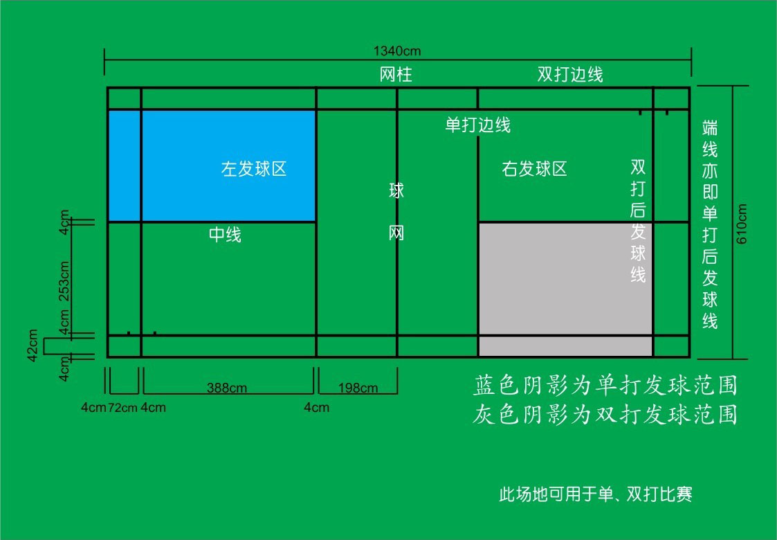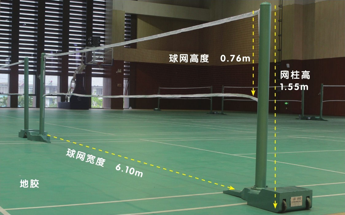 羽毛球场地是中央被球网(边线处网高1.55米,中间顶部网高1.524米)平均分开的长方形场地。场地上空高9米,周围2米内不得有障碍物。