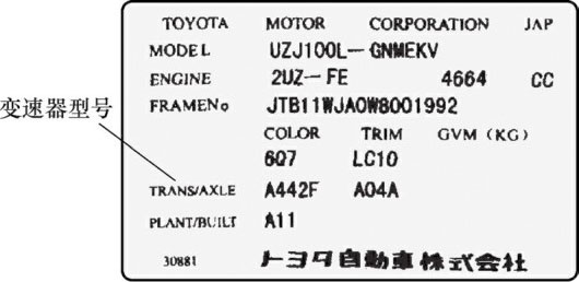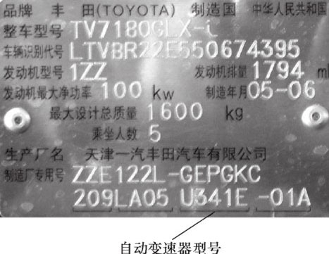 图1-4所示为丰田陆地巡洋舰轿车的铭牌,在变速器型号(TRANS/AXLE)一栏内标有自动变速器型号(A442F)。图1-5所示为一汽丰田花冠轿车的铭牌,自动变速器的型号为U341E。