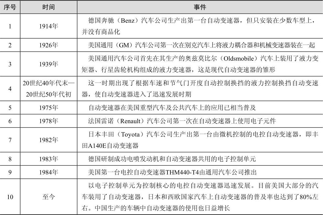 一汽-大众汽车有限公司1998年底在国内首次推出批量生产的装用电控自动变速器的汽车——捷达AT,该车采用德国大众(VW)原厂生产的第三代95型01M电控4挡自动变速器。神龙汽车公司也于1999年初推出了装备4挡电控自动变速器的富康988汽车,这种自动变速器由法国的雪铁龙公司和雷诺公司共同研制,在意大利生产,1998年6月开始应用。上海通用汽车公司的4T65E自动变速器是通用汽车公司1994年正式投产的。目前我国汽车和豪华大客车装用电控自动变速器已呈普及之势。国产汽车普遍装用自动变速器的时代已经到来,国产汽车装用自动变速器的车型与型号如表1-3所示。
