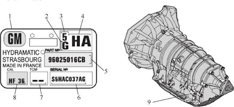 1-产品标识牌;2-变速器系列;3-车型年;4-HA表示3.6L V6(HB表示V6全轮驱动, HF表示2.8L V6);5-零件号;6-序列号;7-空白;8-校准码;9-铭牌位置