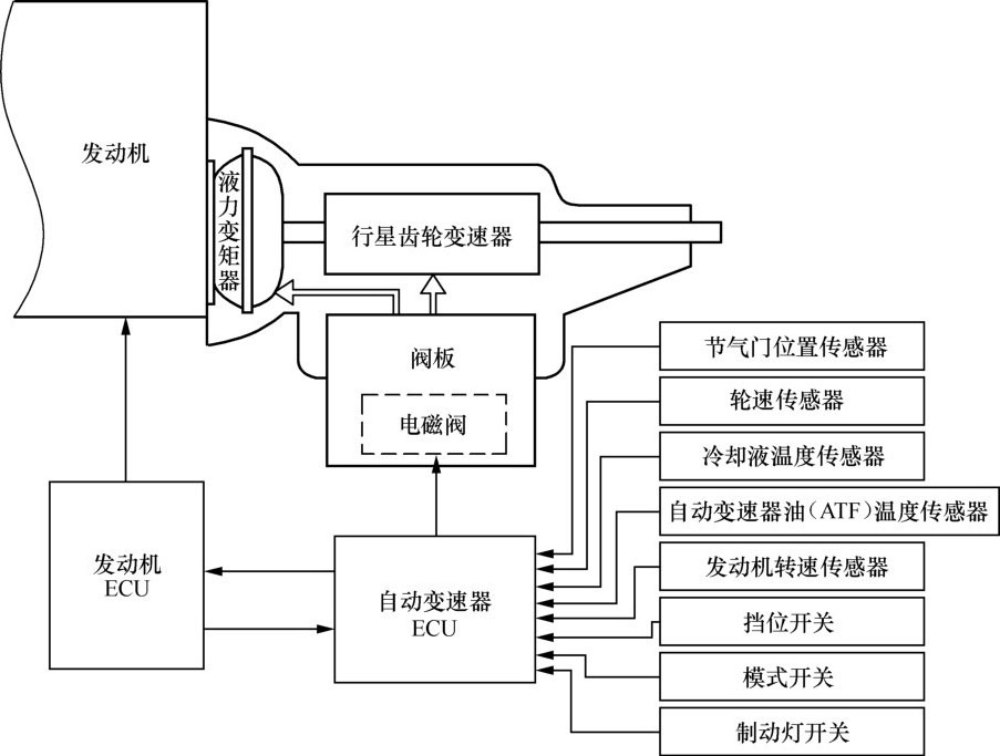 (2)电控自动变速器。它通过各种传感器将发动机转速、节气门开度、车速、发动机冷却液温度、自动变速器油温度等转变为电信号,输入自动变速器ECU,ECU根据这些电信号计算出换挡控制信号并输入到相应的换挡电磁阀,通过换挡阀控制换挡执行机构的动作,实现自动换挡,如图1-11所示。