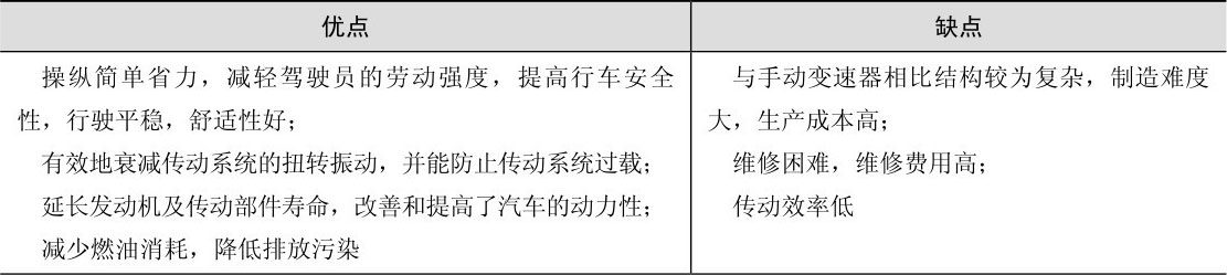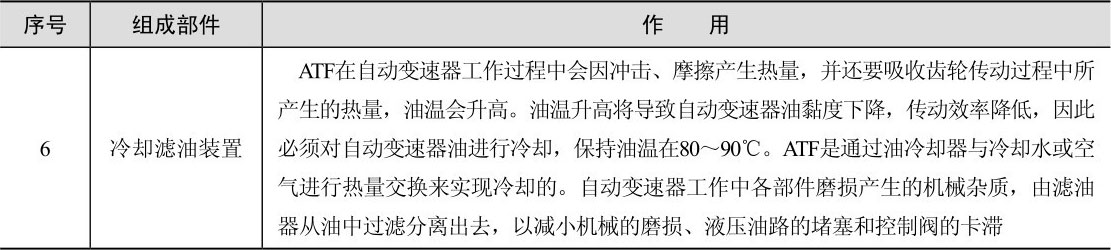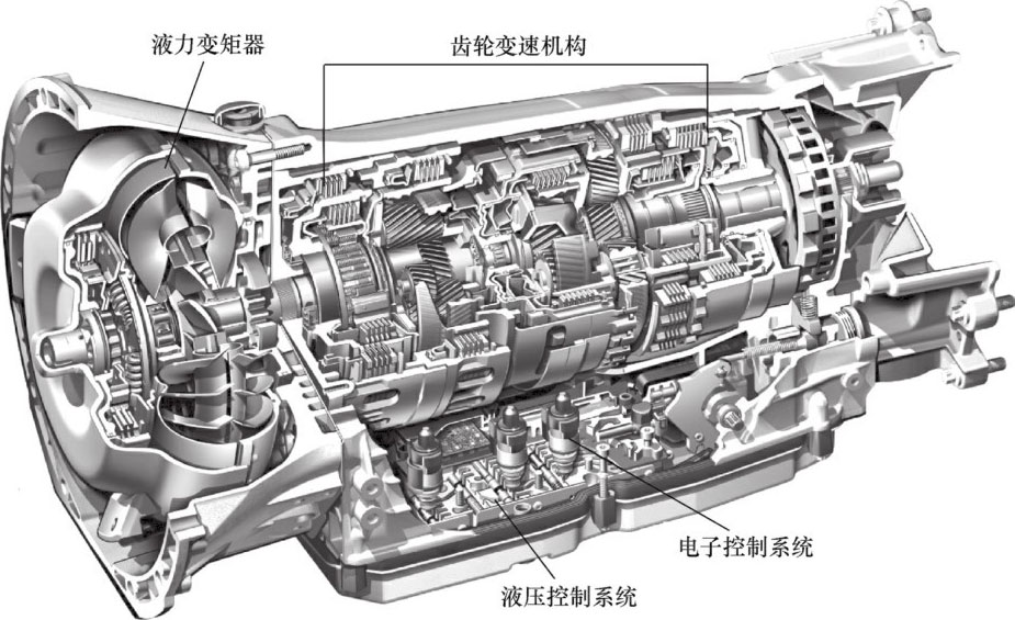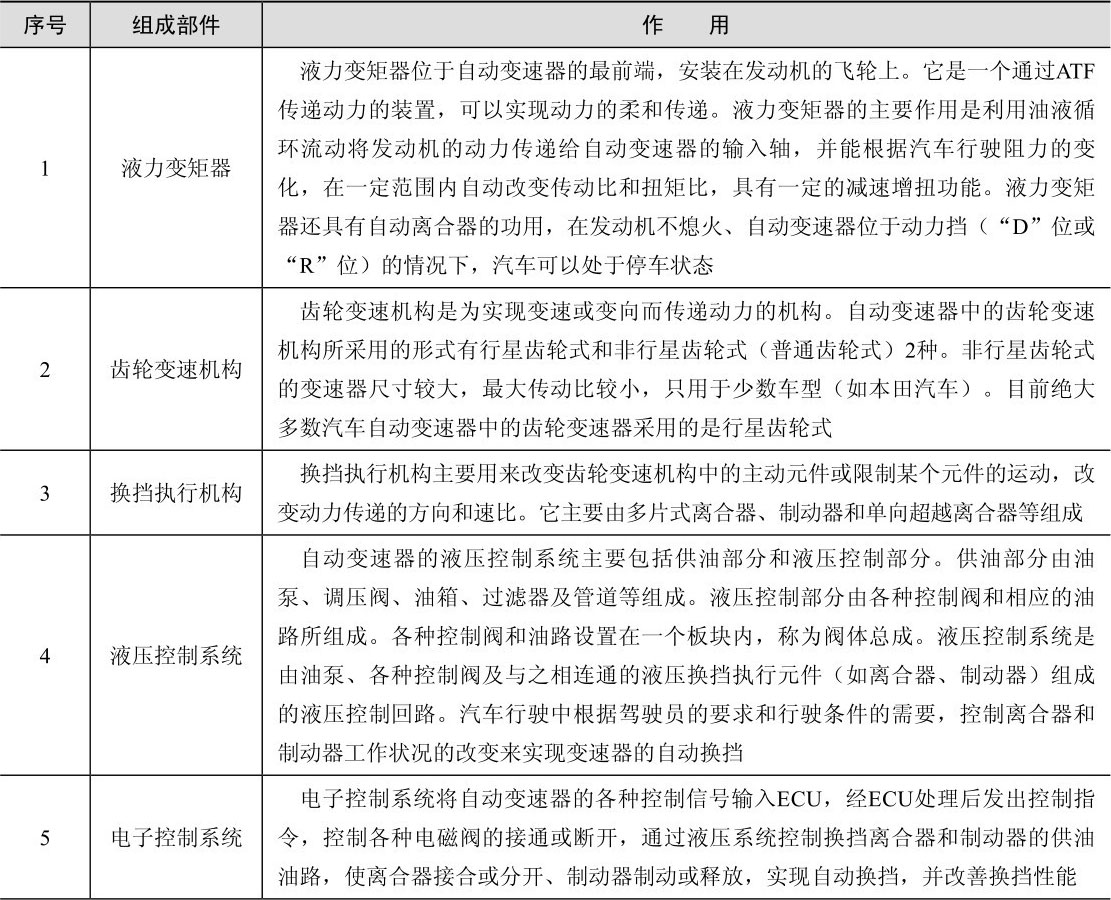 如图1-13所示,液力自动变速器主要由液力变矩器、齿轮变速机构、换挡执行机构、液压控制系统、电子控制系统和冷却滤油装置(图1-13中未画出)等组成,液力自动变速器组成部件的作用如表1-4所示。