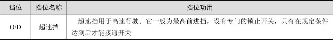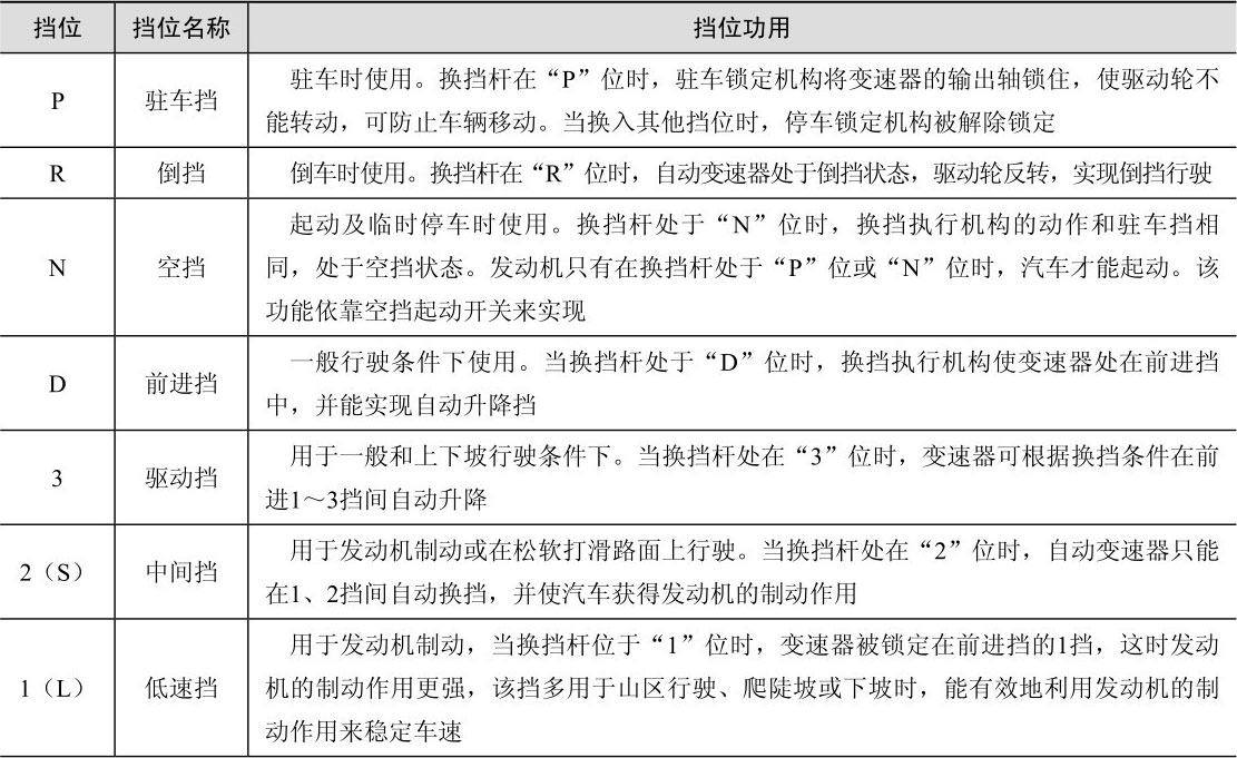 如图1-14所示,自动变速器的挡位一般分为P、R、N、D、3、2和L;有的自动变速器挡位分为P、R、N、O/D、3、2和1。其中,O/D挡为超速挡,3、2、1挡为低速挡。目前,大部分自动变速器换挡杆广泛采用手自一体形式的。