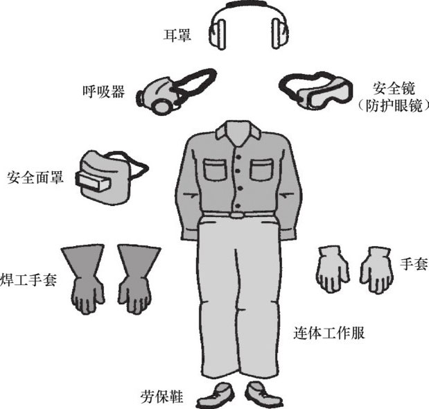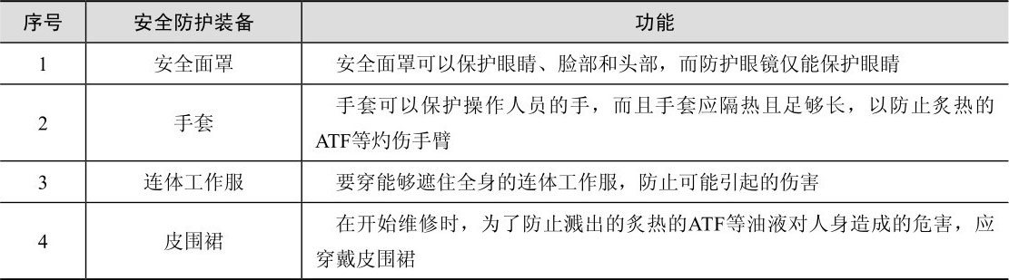 在对自动变速器进行维修时,高温、压缩空气、自动变速器油(Automatic Transmission Fluid,ATF)油压、化学物质等也许会给人身带来伤害。为了保护自己,维修人员需穿戴必要的安全服饰。常见的个人安全防护装备如图1-1所示。个人安全防护装备的作用如表1-1所示。