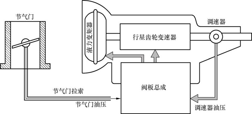 (1)液力自动变速器。它通过机械手段将节气门开度和汽车车速转化为液压控制信号,阀体中各控制阀按照设定的换挡规律控制各换挡执行机构的动作,实现自动换挡,如图1-10所示。