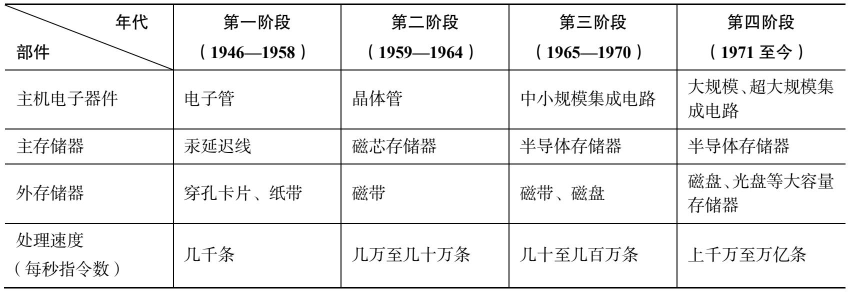 从第一台电子计算机诞生至今的几十年时间里,计算机技术成为发展最快的现代技术之一。根据计算机采用的物理器件,可将计算机的发展划分为4个阶段,如表1-1所示。