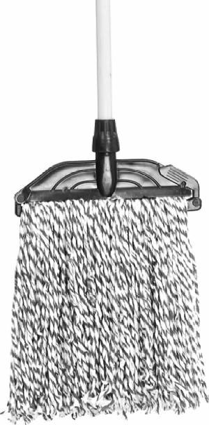 拖布(见图2-4)也称为拖把,是将布条或棉纱安装在手柄上制成的用于室内地面清洗的手工工具。拖布的形状有圆头形和扁平形两种。圆头形是将布条或棉纱绑扎在木、竹或塑料柄把上制成的,其头呈圆状;扁平形是在柄把上安装一扁平塑料或金属夹,用来固定布条或棉纱,其头呈扁平状。