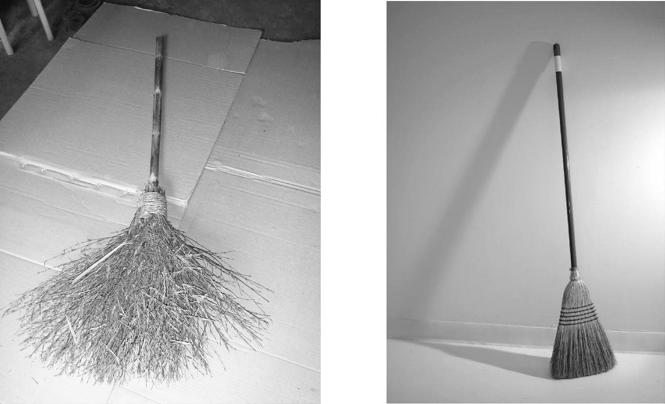 扫帚是用于清扫地面较大碎片和杂物的手工工具。根据用途、形状和制作材料的不同可分为多种,但主要有两类:大扫帚,又叫长柄扫帚,常用于清扫室外地面;小扫帚,又叫单手扫帚,常用于清扫室内地面(见图2-2)。