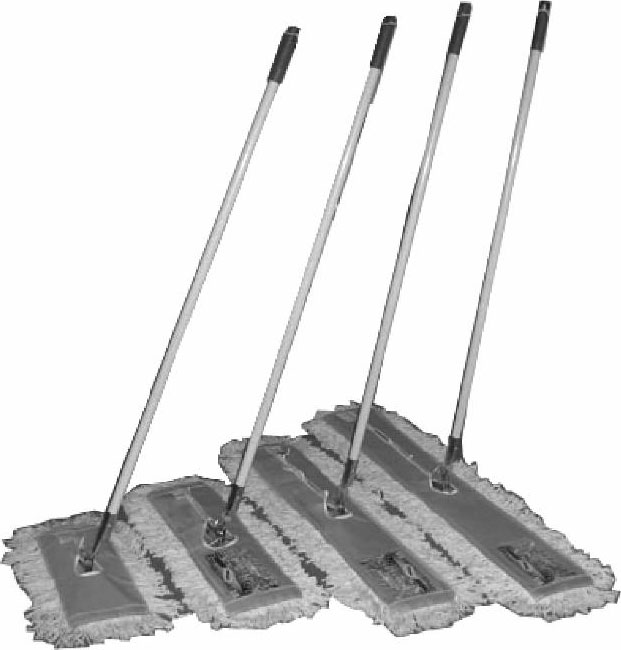 尘拖(见图2-5)又叫推尘、干式拖布、除尘拖布等。尘拖由尘拖头和尘拖架组成,是清除室内地面尘土、沙砾的手工工具。尘拖头有棉类和纸类两种;尘拖架用金属制成,有不同长度和宽度之分。尘拖主要用于对各种高档地面灰尘的清除,操作简单省力,附着灰尘力强,可保持地面光亮,被广泛应用于大厦的日常保洁。