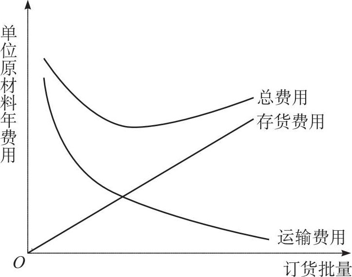 第四,物流活动由一系列的要素构成。物流活动不仅是对运输、存货管理、装卸搬运、配送、包装加工、信息管理等要素的简单集合,而且是对这些要素的整体设计和一体化管理,实现物流诸要素的整体最优。以存货费用和运输费用为例,在图1-1中,企业每一单位原材料年存货费用随着订货批量的增加而增加,每一单位原材料年运输费用则随着订货批量的增加而减少,最优订货批量是每一单位原材料年存货费用与年运输费用之和最小的订货批量,即由总费用曲线的最低点决定。