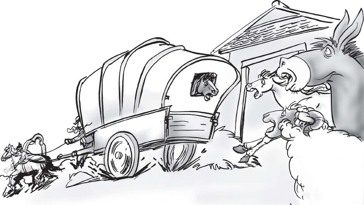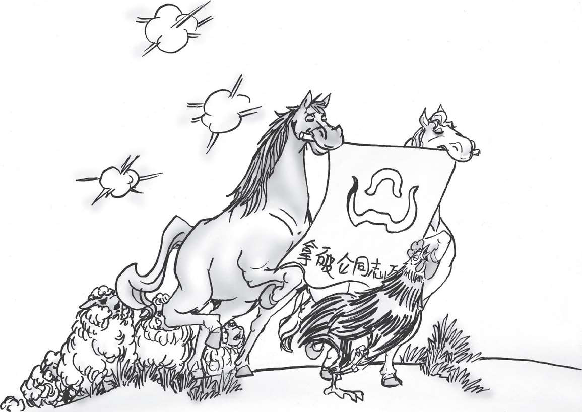 “笨蛋!一群笨蛋!”本杰明叫道,一边绕着他们大叫大跳,一边用他的小蹄子不断地跺着地面,“笨蛋!难道你们没看见车身上写着什么吗?”