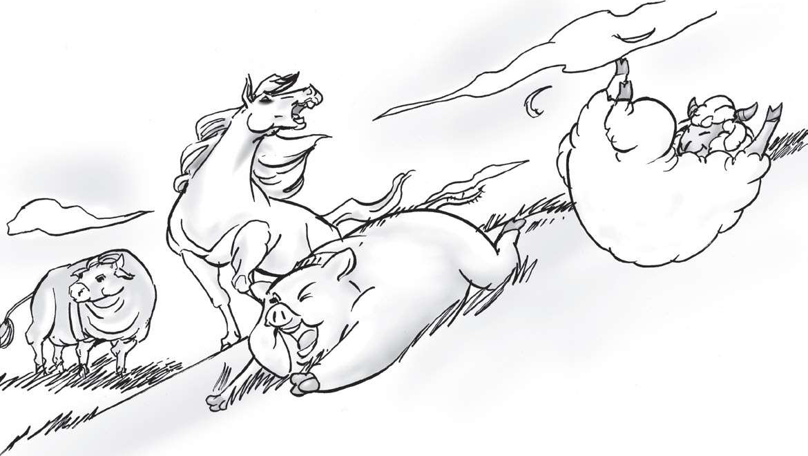 猪遭遇的更为棘手的事情,是对付驯化了的乌鸦摩西散播的种种谣言。摩西这个琼斯先生特别钟爱的宠物,是个喜欢刺探消息和搬弄是非的家伙,还是个巧舌如簧的说客。他声称他知道有一个叫作蜜饯山的神秘的地方,所有的动物死后都把那里作为归宿。根据摩西的说法,那个神秘的地方就在天空中云层上面不远的某个地方。摩西说,在蜜饯山,每周七天都是星期天,一年到头都有当令的新鲜苜蓿,方糖和亚麻子饼就长在树篱上。动物们讨厌摩西,因为他总是散播闲话而不劳动。但是也有一些动物相信有蜜饯山,所以,猪不得不费尽唇舌去解释,使动物们明白世界上根本就没有那样的地方。