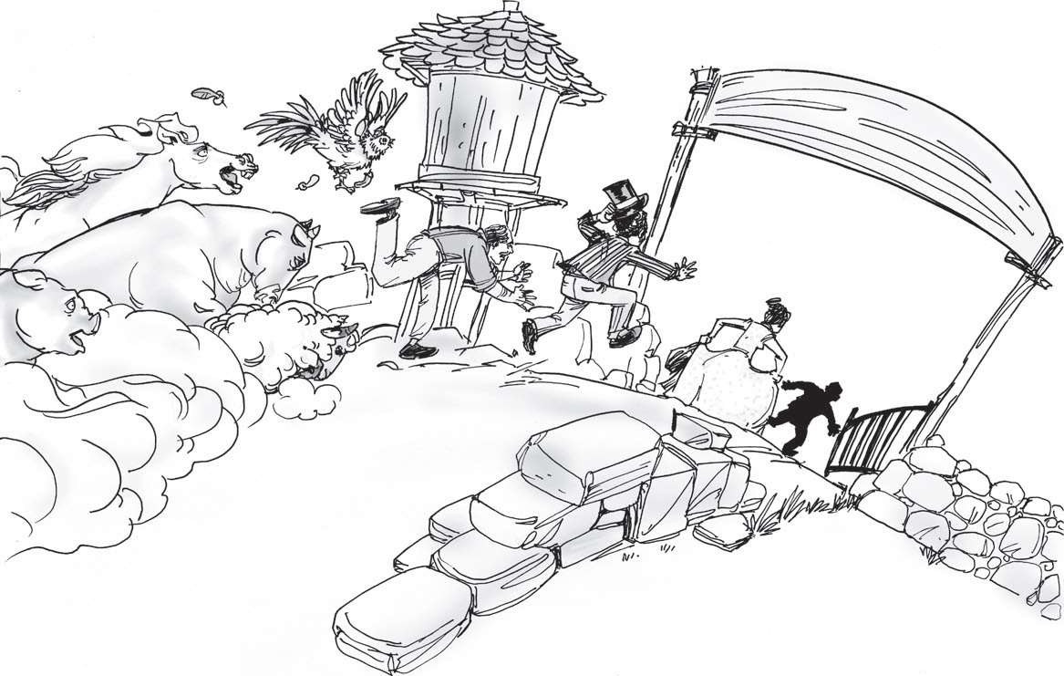 六月到了,差不多到了收割牧草的时节。在施洗约翰节 的前夕,那天是星期六,琼斯先生去了趟威灵登,在红狮子酒吧喝得烂醉如泥,直到星期天的正午时分才回来。他的伙计们大清早挤完牛奶,根本没有给动物们添加草料,就外出打野兔去了。而琼斯先生一回来,就躺在客厅沙发上睡着了,一张《世界新闻报》盖在了他的脸上。所以一直到傍晚,还没有人给动物们喂过东西。最终,动物们实在无法忍受了,有一头母牛用角顶开了饲料棚的门,于是,所有的动物蜂拥而上,自行从饲料箱里抢取食物。正在这个时候,琼斯先生醒了。转瞬间,他和他的四个伙计手里拿着鞭子来到了饲料棚,上来就是一阵胡乱抽打。原本一直挨饿的动物们对此早已不能忍受。尽管事先毫无任何谋划,动物们竟都不约而同地向这些虐待他们的人猛冲过去。琼斯先生和他的几个伙计忽然发现他们正处在四面受敌的境况中,遭到了动物们的角抵蹄踢,局面完全失去了控制。他们还从未见到动物有过如此行为,他们对待这一群牲畜一直就是随心所欲地鞭打和虐待。这群牲畜的毫无征兆的暴动,把他们吓得几乎魂不附体。不到一会儿工夫,琼斯先生和他的伙计们就放弃自卫的企图,滑脚溜走。又过了一会儿,在动物们所向披靡的追击下,他们五个人全都沿着通往大路的车道拼命逃窜。