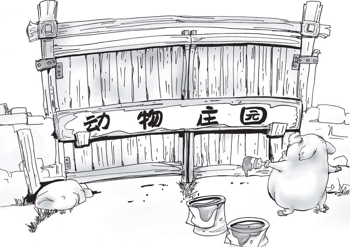 这时,猪首脑们才透露在过去的三个月中,他们从一本旧的拼音书本上自学了阅读和书写。那本书原本属于琼斯先生的孩子们,后来被扔到了垃圾堆里。拿破仑派部下弄来几桶黑漆和白漆,带领大家来到朝向大路的五闩大门。接着,雪球(因为雪球的字写得最好)用蹄子的两个肘子夹起一把刷子,涂掉了大门顶端一道闩上的“曼纳庄园”几个字,又在那上面涂上“动物庄园”。从此以后,这就是庄园的名字。写完以后,大伙儿又回到窝棚那里,雪球和拿破仑派部下搬来一架梯子,并把梯子靠在大谷仓的墙头。猪首脑们解释说,通过过去三个月的思索,他们已经成功地把动物主义的要旨提炼为“七诫”,这“七诫”现在就要被题写在墙上,它们将成为一部至高无上的法律,动物庄园里所有动物的生活都必须永远以它为准则。雪球费了很大的周折才爬了上去(因为猪在梯子上很难保持平衡)并开始忙活起来。声响器提着油漆桶站在稍低几个梯级的地方,在涂过柏油的墙上,用巨大的白漆字母写着“七诫”,在三十码以外的地方也看得一清二楚。上面写着: