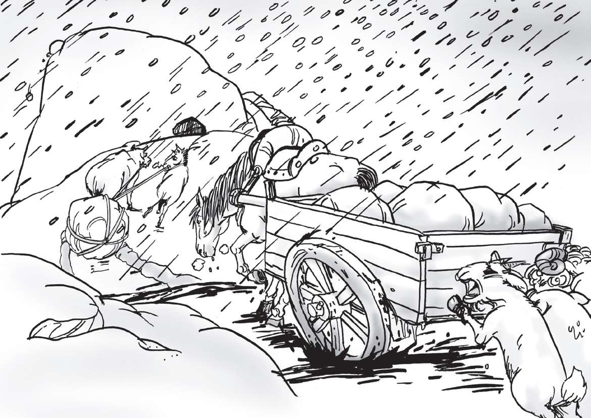 他拖着沉重的步子离开了,向采石场走去。到了那儿,他一口气装了两车石头,把它们都拉到风车工地上,然后才回去睡觉。