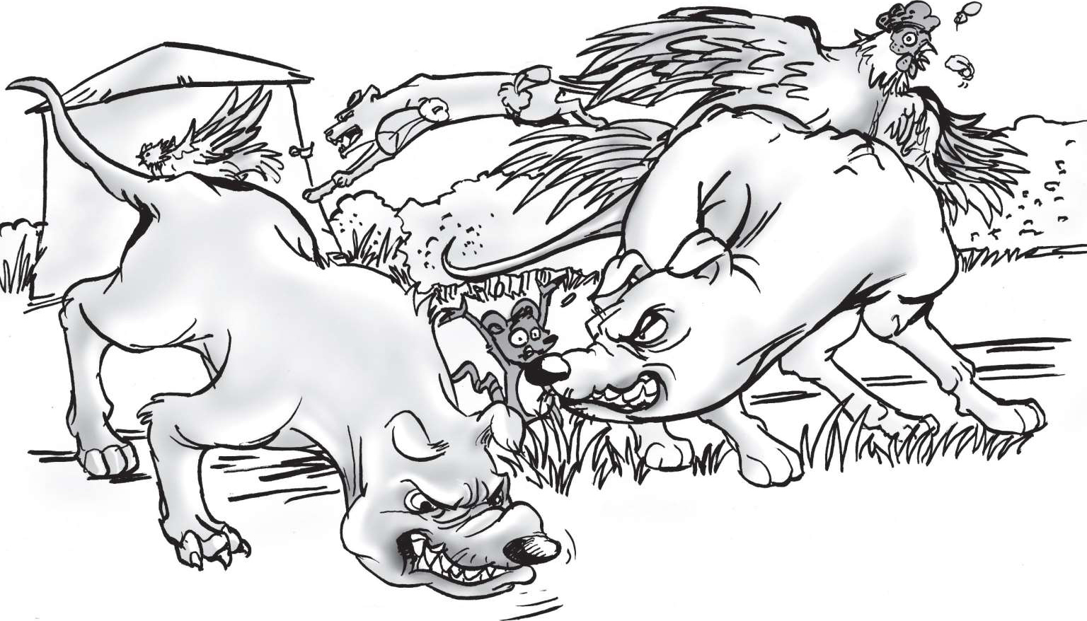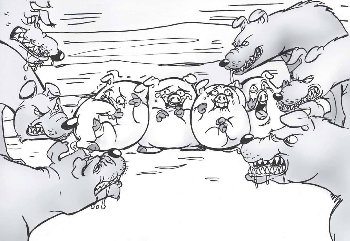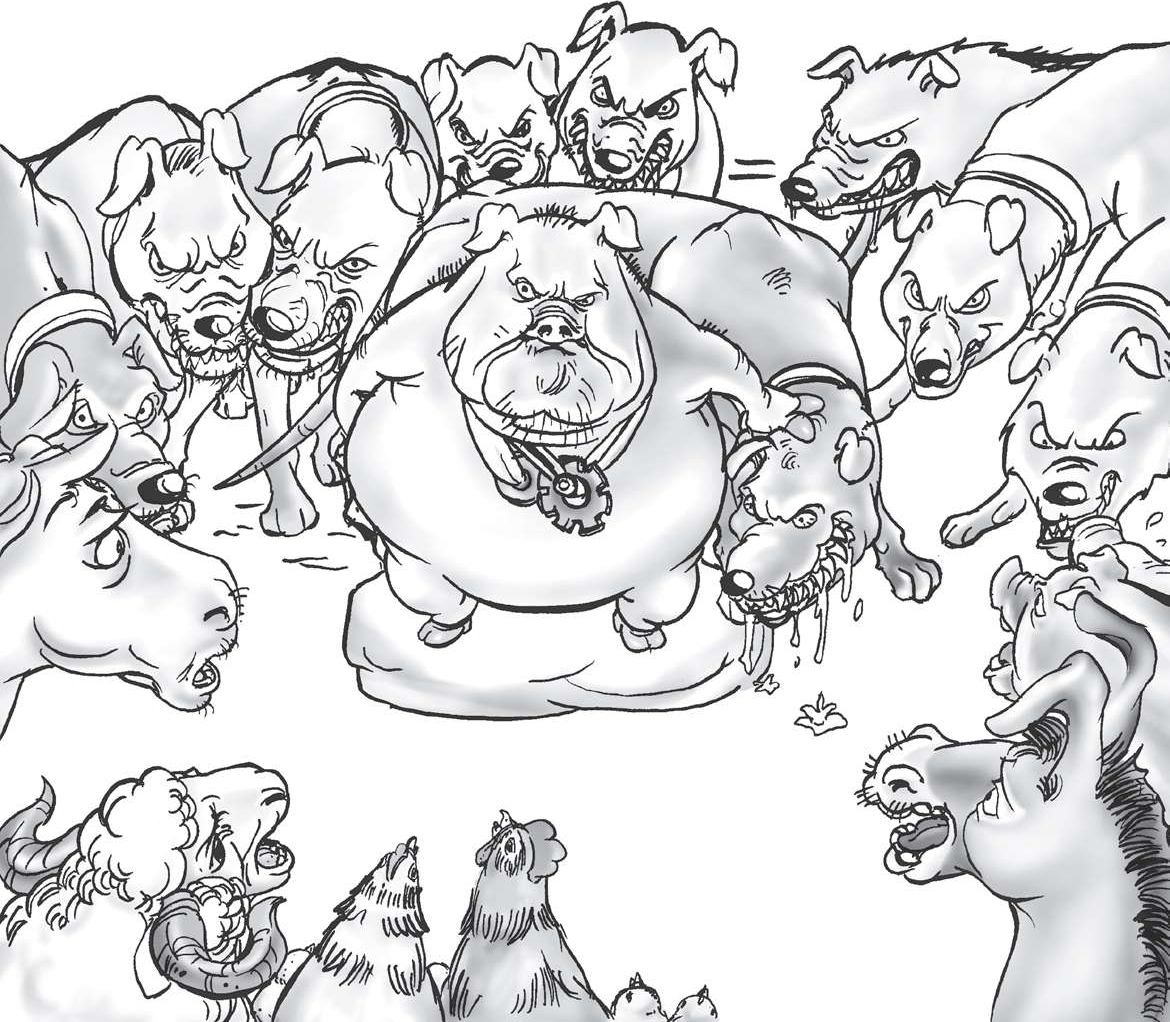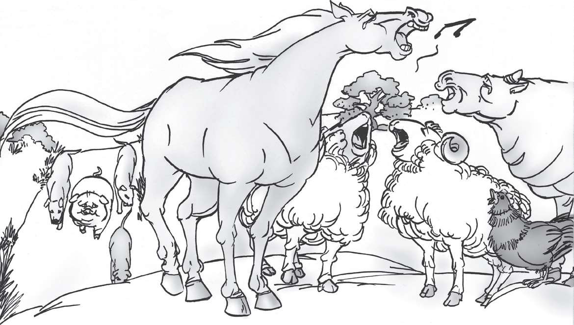 动物们虽然被吓得惊恐万状,但还是有些动物似乎要提出抗议。可偏偏这个时候,绵羊们大声咩咩地喊起那套“四条腿好,两条腿坏”的老调子,持续了几分钟之久,这场争议也就宣告结束。